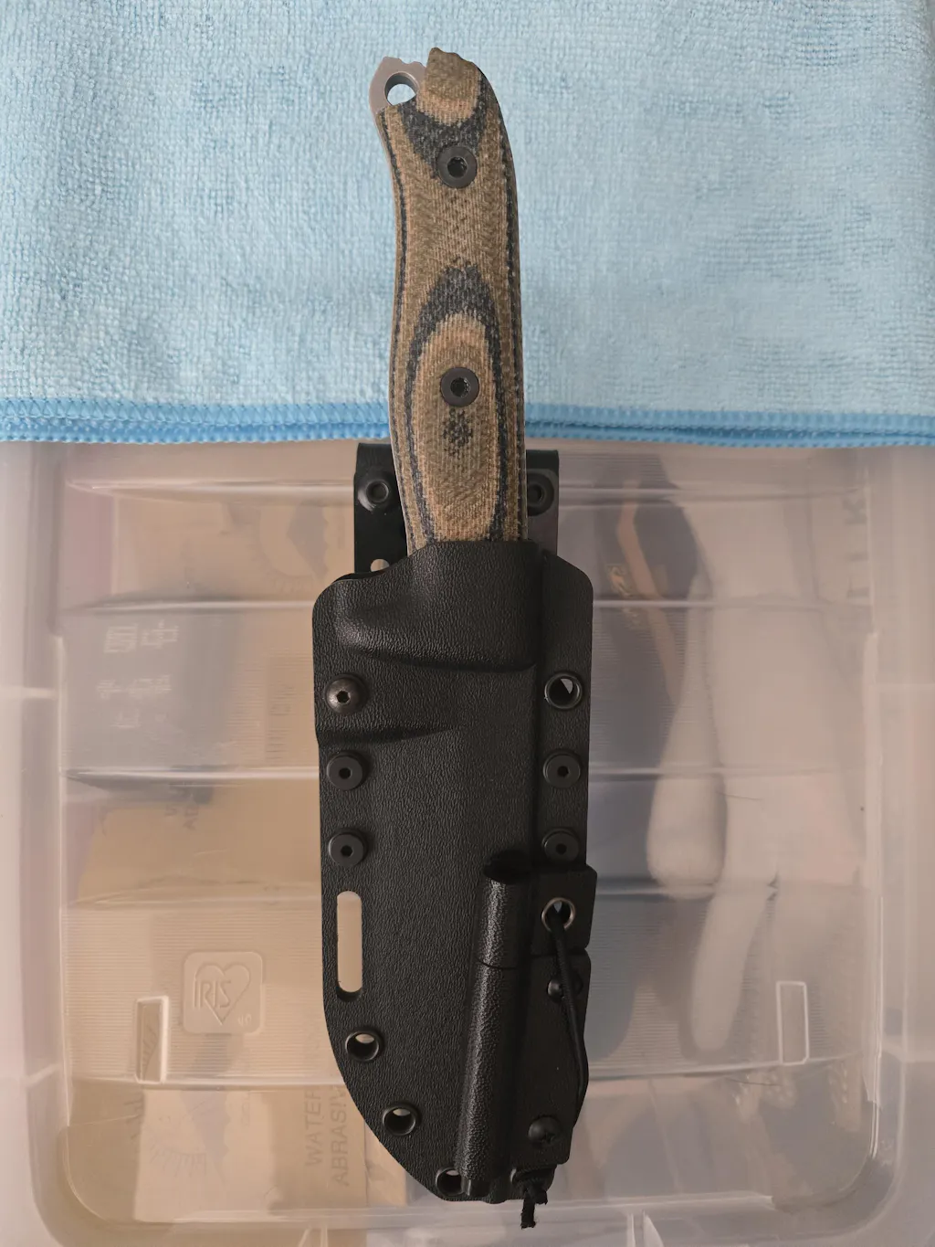 Très bonne tenue en main du couteau avec les nouvelles plaquettes. A part l'esthétique qui est vraiment réussie il n'y a pas de changement pour rentrer le couteau dans son fourreau. La visserie d'origine tient parfaitement les plaquettes.